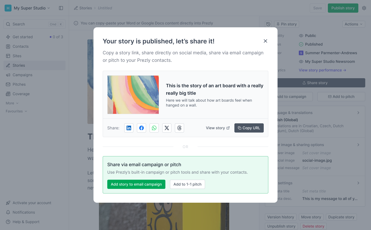 Story settings panel: now includes a Share button (panel opens by default once a story is published).